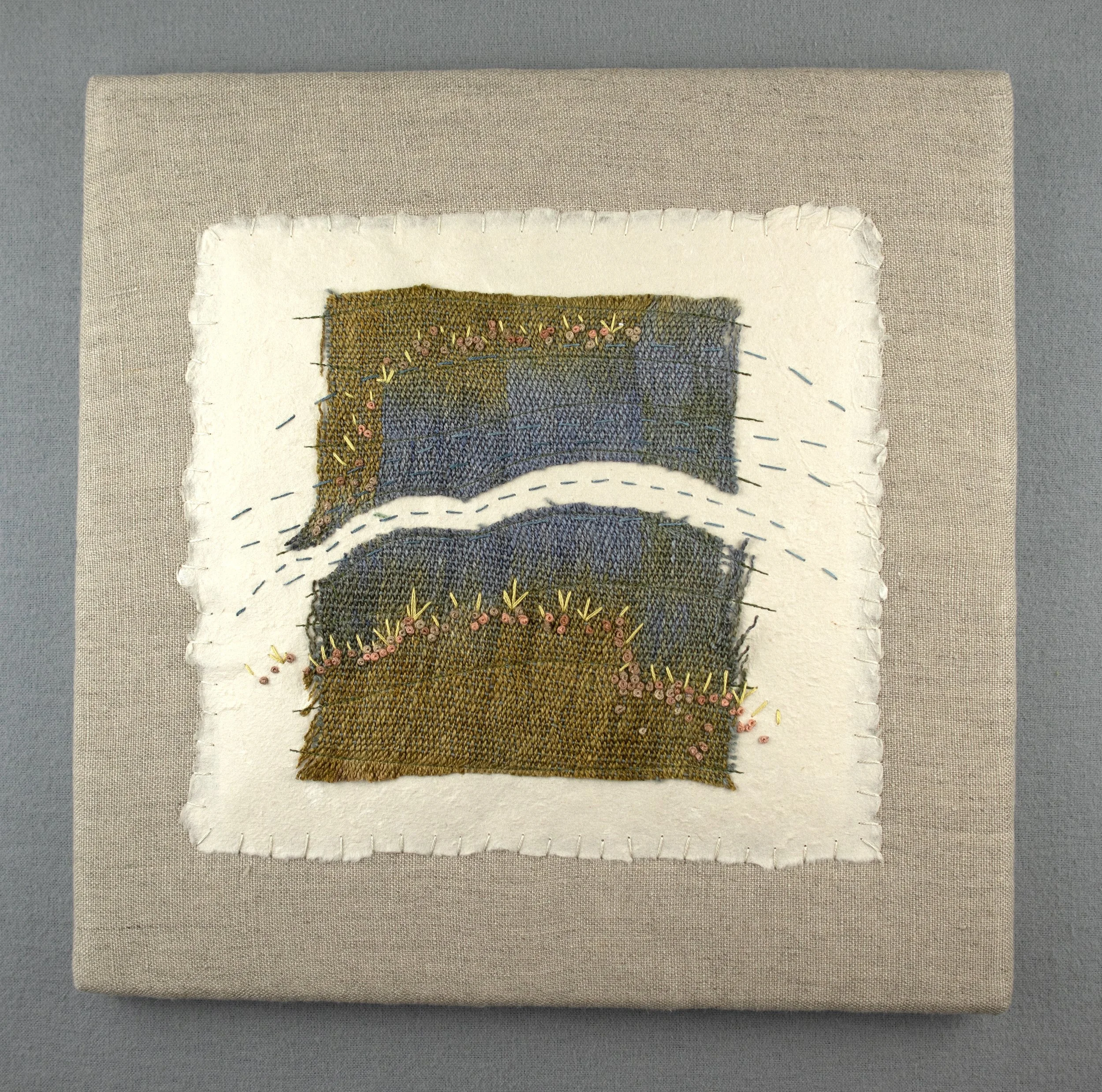 Mixed media - hand painted linen handwoven fabric, machine stitched with hand embroidery on handmade paper.