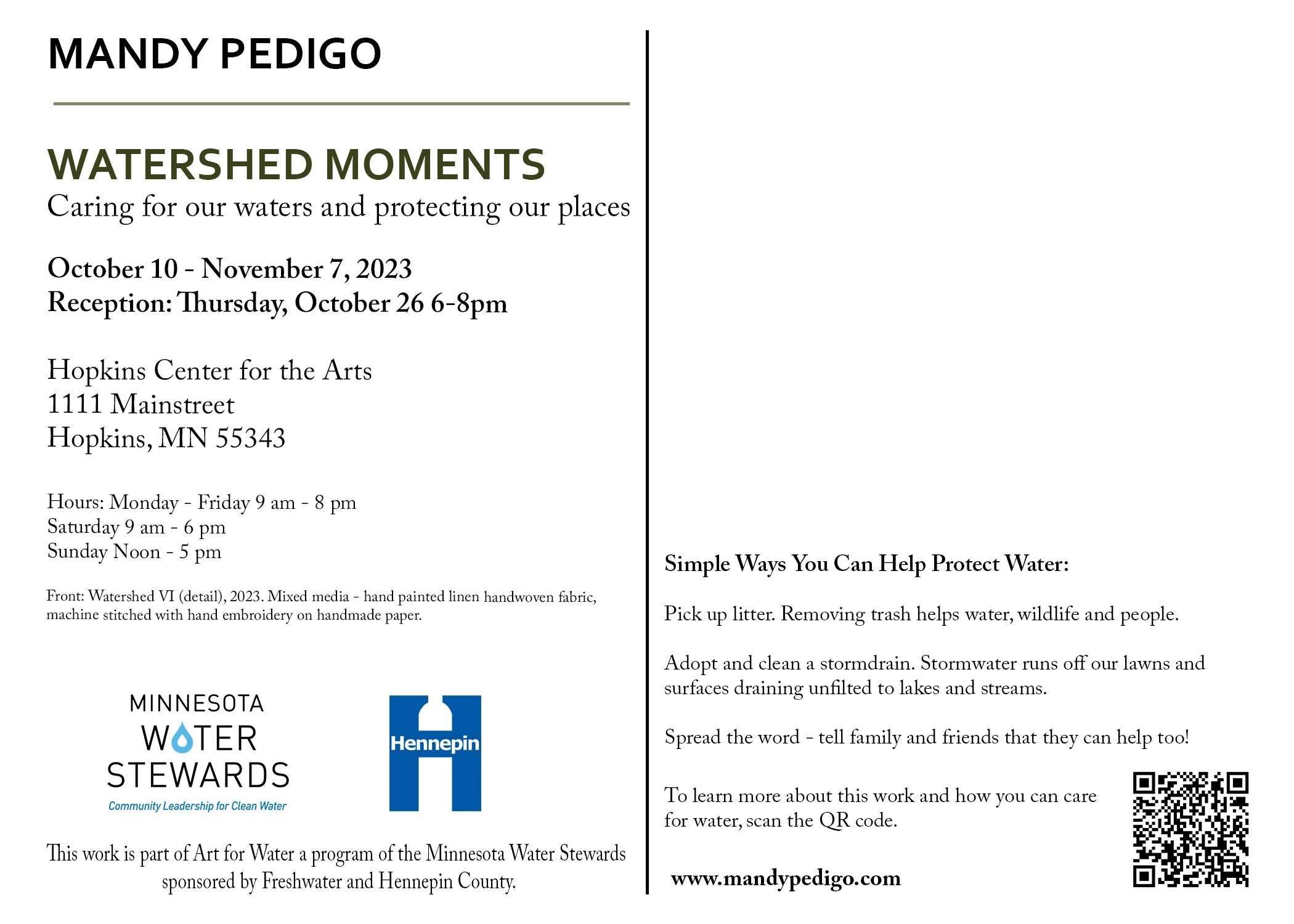 My project with Art for Water, a program of the Minnesota Water Stewards and sponsored by Freshwater and Hennepin County, has reached its conclusion. My exhibition, Watershed Moments, opens October 10 and runs through November 7th at the Hopkins Center for the Arts. The opening reception is October 26, 6 - 8 pm in the member artist spotlight on the first floor of the center.