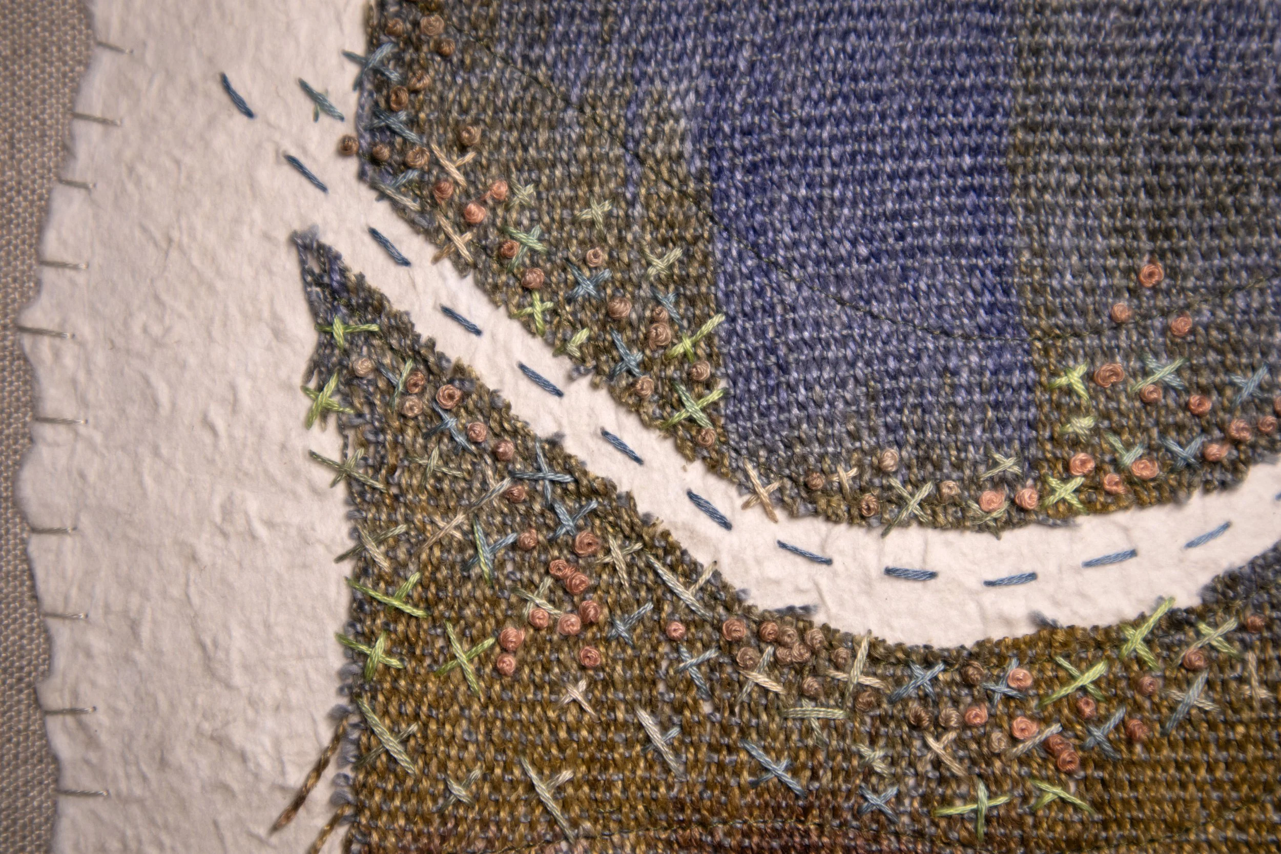 The work is this eight-piece series composed of layers of handmade paper, painted and handwoven fabric, and embroidery. They form interconnected maps with each other and stand alone as well. My work has always had a theme of connection to nature. As a new Minnesotan, I have been thinking about what it means to be in relationship with the places and waters around me. There is imperative to care in this mutual relationship. The land and waters provide a home and life for us and we must do our part to care for them as well. The Water Steward program offered me a starting point of knowledge about how we as a community can protect our waters. This protection starts with our individual connections with places that we love.