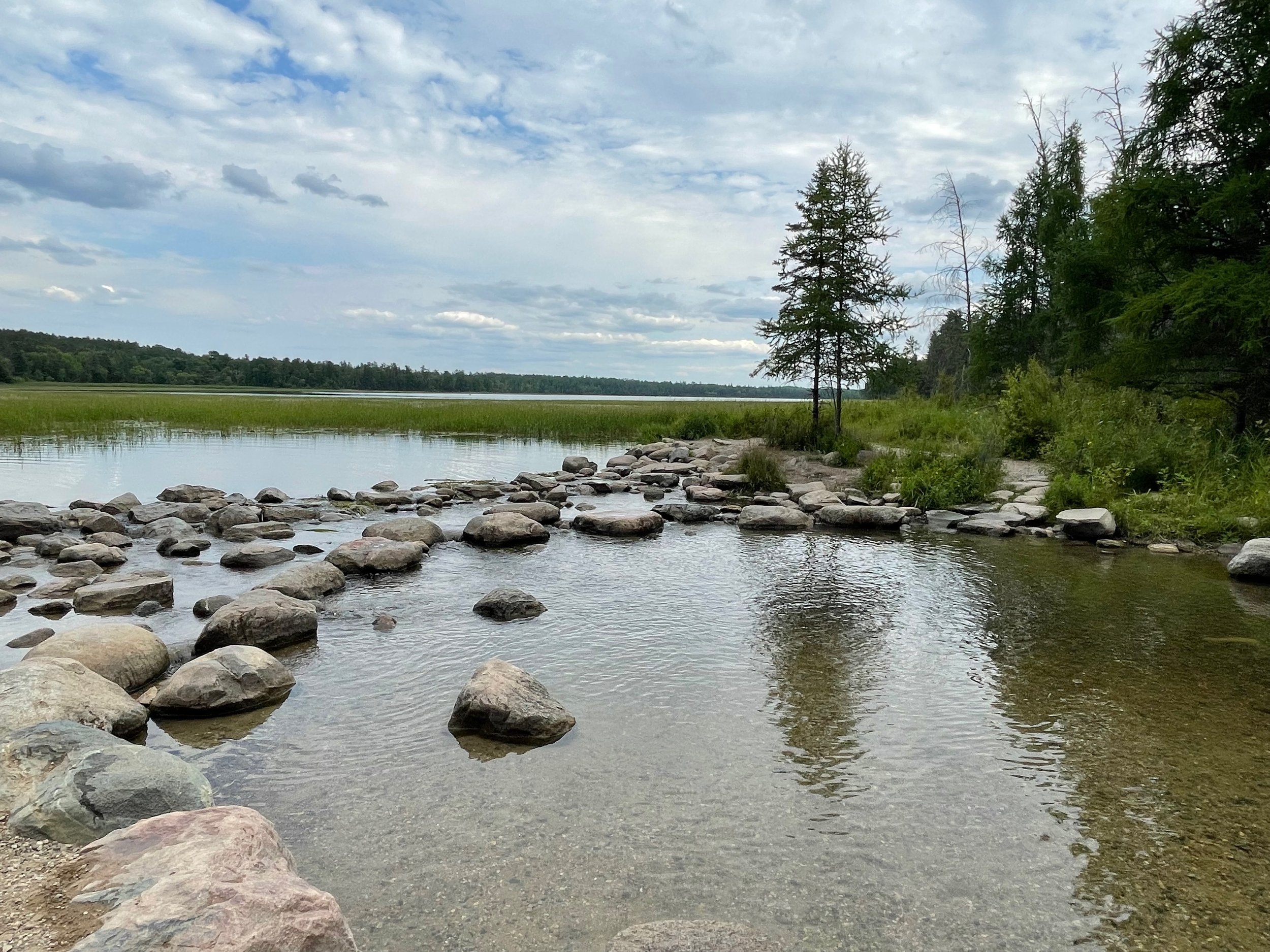 The Mississippi River at the headwaters is quiet. It emerges from Lake Itasca where wild rice sways in the wind. The boundary between the lake and the river is marked by stones. Some tourists scramble over the rocks to cross the river to the other side while others wade. At the time of our visit the water levels were lower than when my husband visited so long ago. We waded into the water to cross. The crossing water was shallow, cold, and clear.