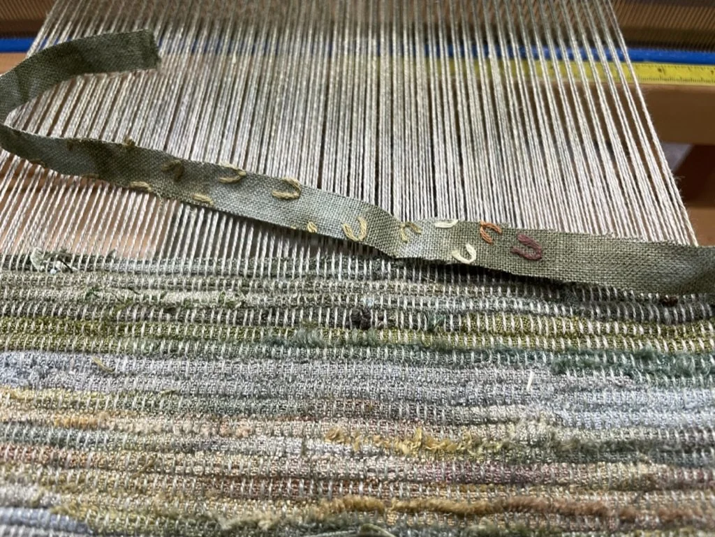 Rag rug in progress on the loom with stitch remnants from a previous incarnation.