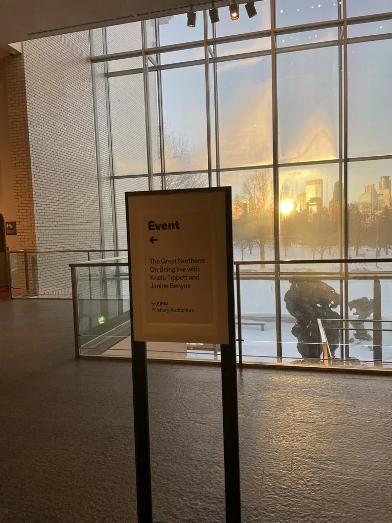 The Great Northern Festival in Minneapolis is a two week annual winter festival to celebrate the cold, dark times in the north with programming about art, creativity, food, culture and to spotlight climate concerns. Yesterday as part of this festival, I had the chance to attend a live podcast recording of On Being with Krista Tippett. Tippett was interviewing biologist, writer and consultant Janine Benyus. I wasn’t familiar with Benyus before this event and I’m surprised that I’ve missed her work. Benyus popularized the term “biomimicry,” a discipline to use nature as a mentor to create designs and processes to create a more sustainable planet. You can watch her excellent TED talk https://www.youtube.com/watch?v=k_GFq12w5WU to learn more. I plan on reading her book Biomimicry: Innovation Inspired by Nature.
