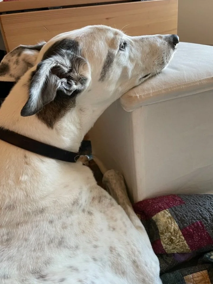 Sam has been a character in life, in my social media posts and in stories that would tell friends since we adopted him in the fall of 2013. He was such a naughty wonderful dog. He retired from racing at almost five. He had to be taught how to be a dog, to go up and down stairs, about windows and glass doors.