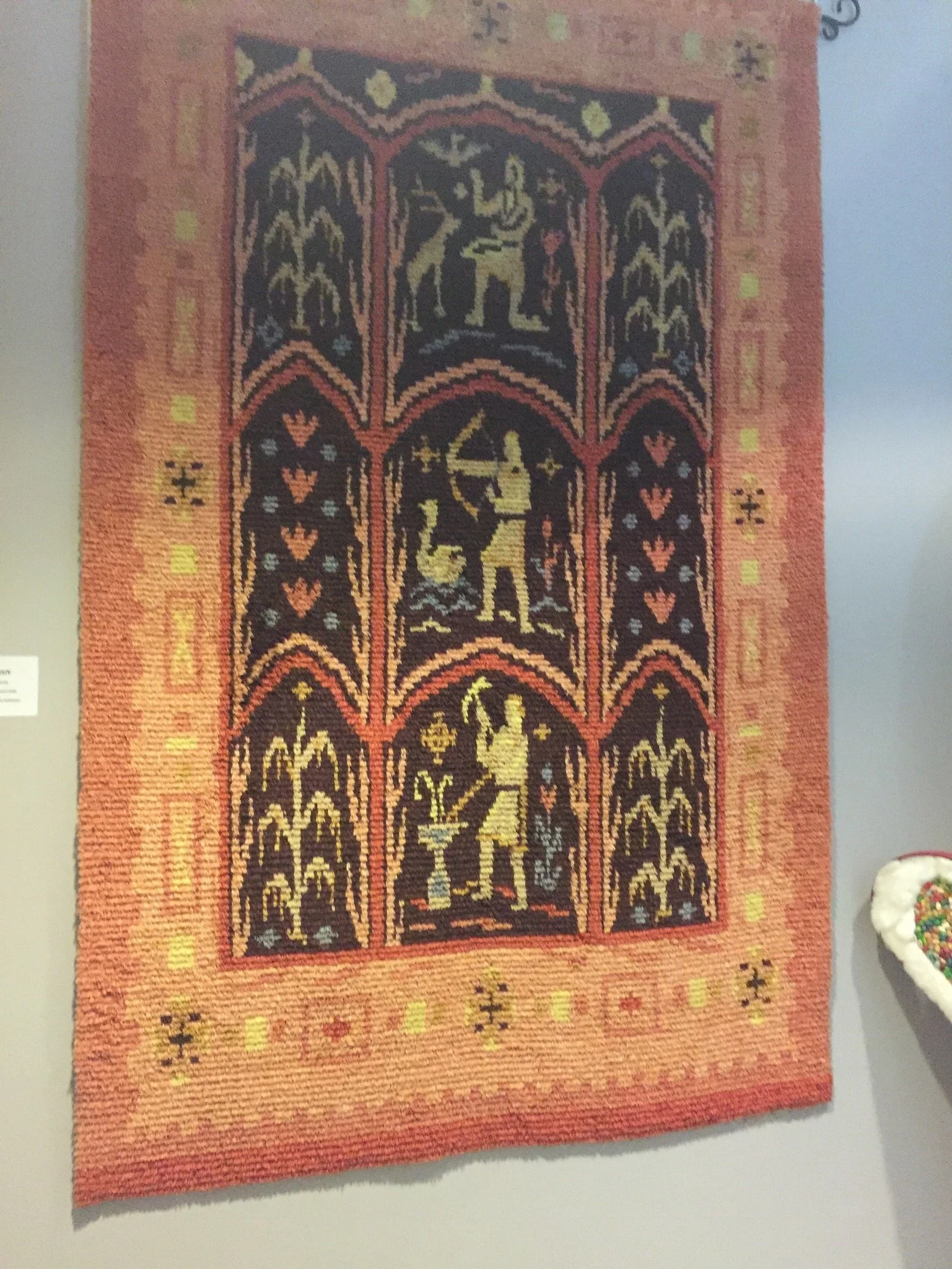 Ryijy - Heroes of the Kalevala. Woven in Kajaani, Finland in 1936. Hanging in the Finnish American Center.